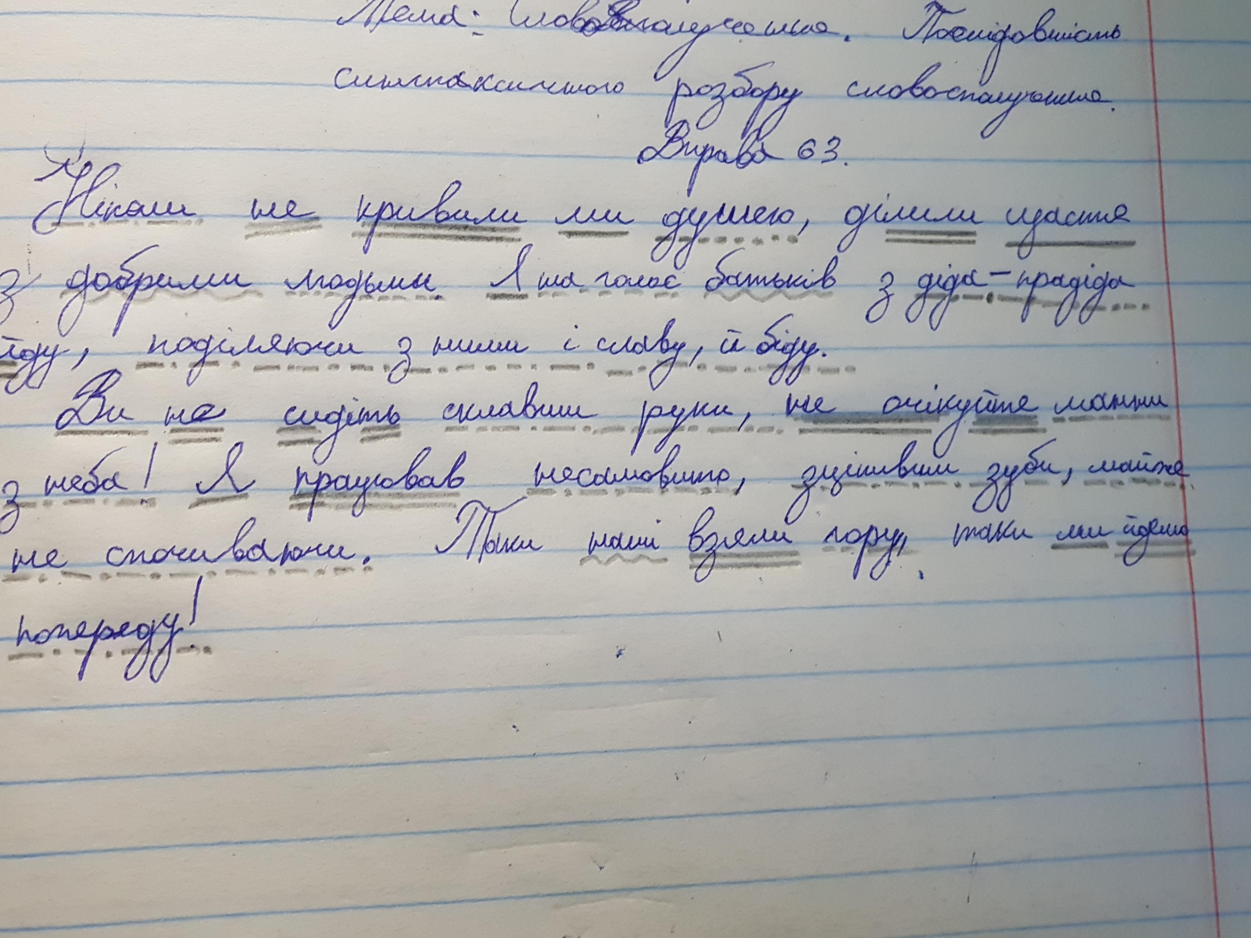 68 Перепишіть. У кожному реченні визначте й підкресліть усі члени речення. 1. Ніколи не кривили ми душею, ділили щастя з добри- ми людьми 2. Я на голос батьків з діда-пра- діда йду, поділяючи з ними і славу, й біду 3. Ви не сидіть склавши руки, не очікуйте манни з неба! . 4. Я працював несамовито, зціпивши зуби, майже не спочиваючи 5. Таки наші взяли гору, таки ми йдемо попереду!