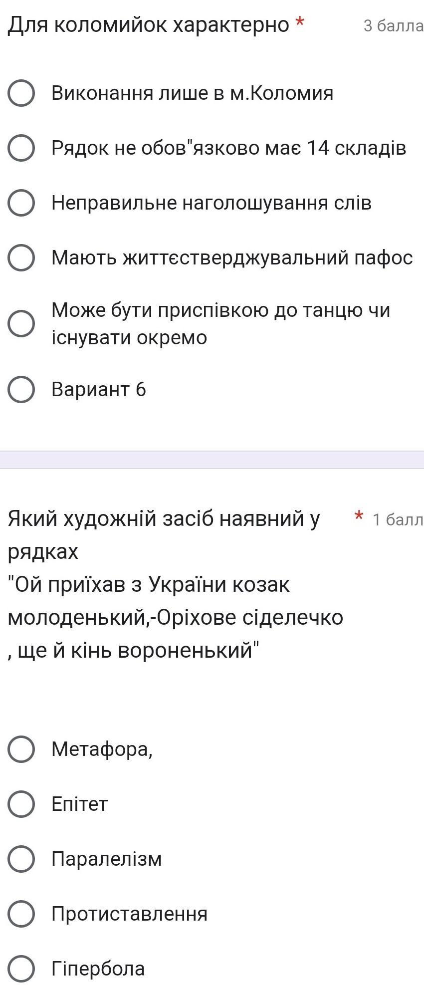 Для коломийок характерно о виконання лише в м.Коломия Рядок не обов'язково має 14 складiв Неправильне наголошування слів о Мають життєстверджувальний пафос Може бути приспiвкою до танцю чи існувати окремо Вариант 6 Який художній засіб наявний у рядках "Ой приїхав з України козак молоденький,-Оріхове сіделечко ще й кінь вороненький" о Метафора, Епітет * о Паралелізм Протиставлення 3 балла О Гіпербола * 1 балл