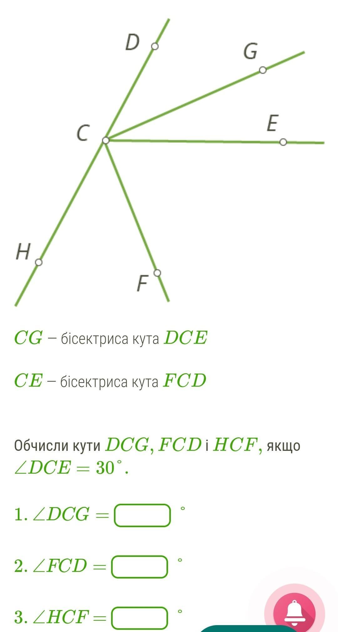 Обчисли кути DCG,FCD і HCF, якщо ∠DCE=30°.