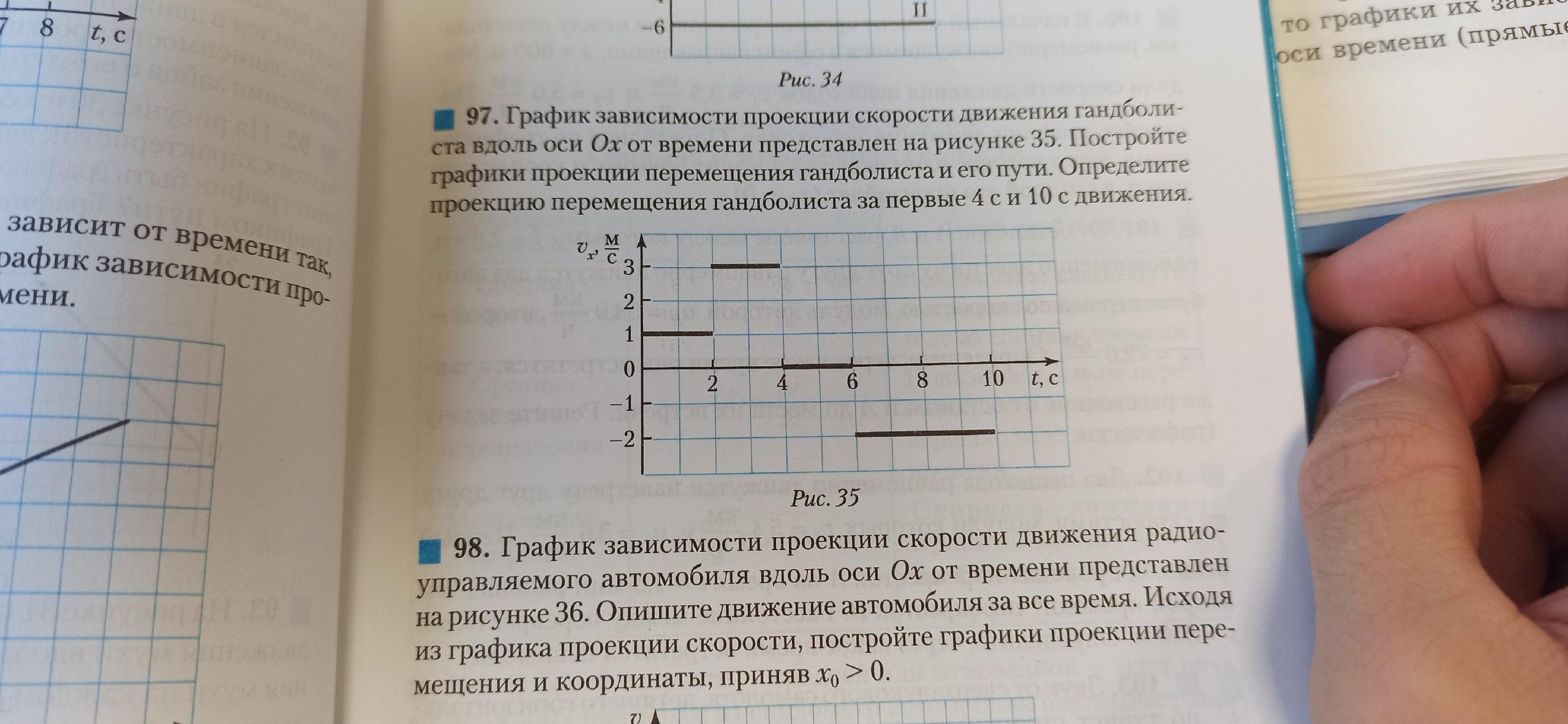 график зависимости проекции скорости движения гандболиста вдоль оси 0x от времени представлен на рисунке 35. Постройте графики проекции перемещения гандолиста и его пути. Определите проекцию перемещения гандолиста за первые 4с по 10 с движения.