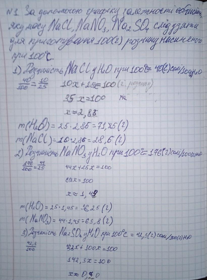 З допомогою графіка залежності обчисліть яку массу NaCl, NaNO3, Na2SO4 слід узяти для приготування 100г розчину, насиченого за температури 100°С. 2)До якої температури необхідно остудити розчин NaNO3 щоб половина солі випала в осад?