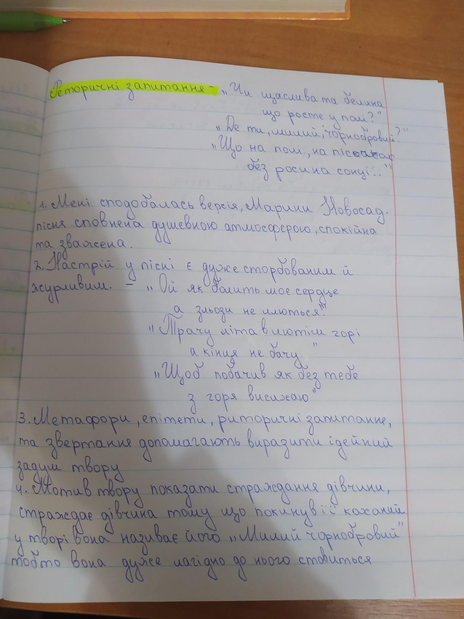 Які переживання викликала у вас пісня «Віють вітри, віють буйні»? Схарактеризуйте ліричну героїню пісні. Поміркуйте, чи шкодує вона, що зазнала кохання. Знайдіть у тексті пісні й випишіть у зошит сталі епітети, ПОРІВНЯННЯ. Яку роль вони виконують у текстi?