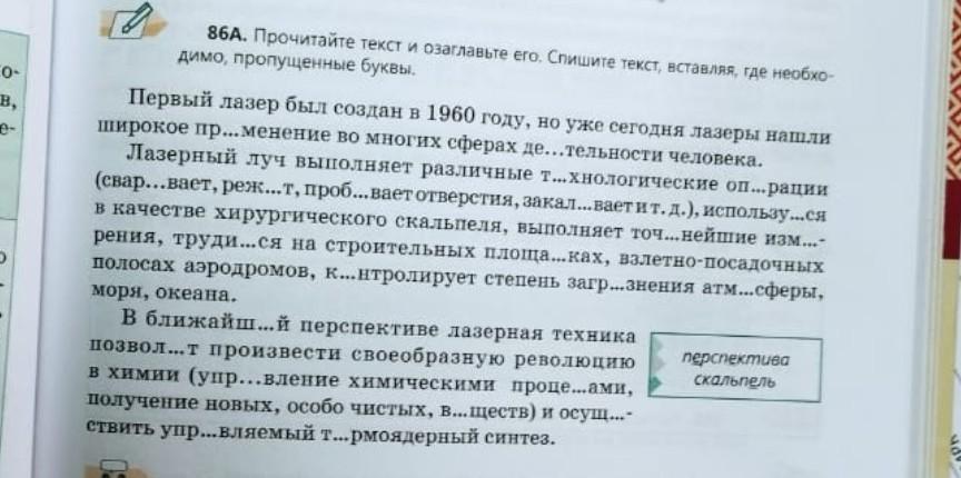 86А. Прочитайте текст и озаглавьте его. Спишите текст, вставляя, где необхо- димо, пропущенные буквы. Первый лазер был создан в 1960 году, но уже сегодня лазеры нашли широкое пр...менение во многих сферах де...тельности человека. Лазерный луч выполняет различные т..хнологические оп...рации (свар...вает, реж...т, проб...вает отверстия, закал...ваетит.д.), использу...ся в качестве хирургического скальпеля, выполняет точ...нейшие изм... рения, труди...ся на строительных площа...ках, взлетно-посадочных полосах аэродромов, к...нтролирует степень загр...знения атм...сферы, моря, океана. В ближайш...й перспективе лазерная техника позвол...т произвести своеобразную революцию в химии (упр...вление химическими проце...ами, получение новых, особо чистых, в...ществ) и осущ...- ствить упр...вляемый т...рмоядерный синтез.
