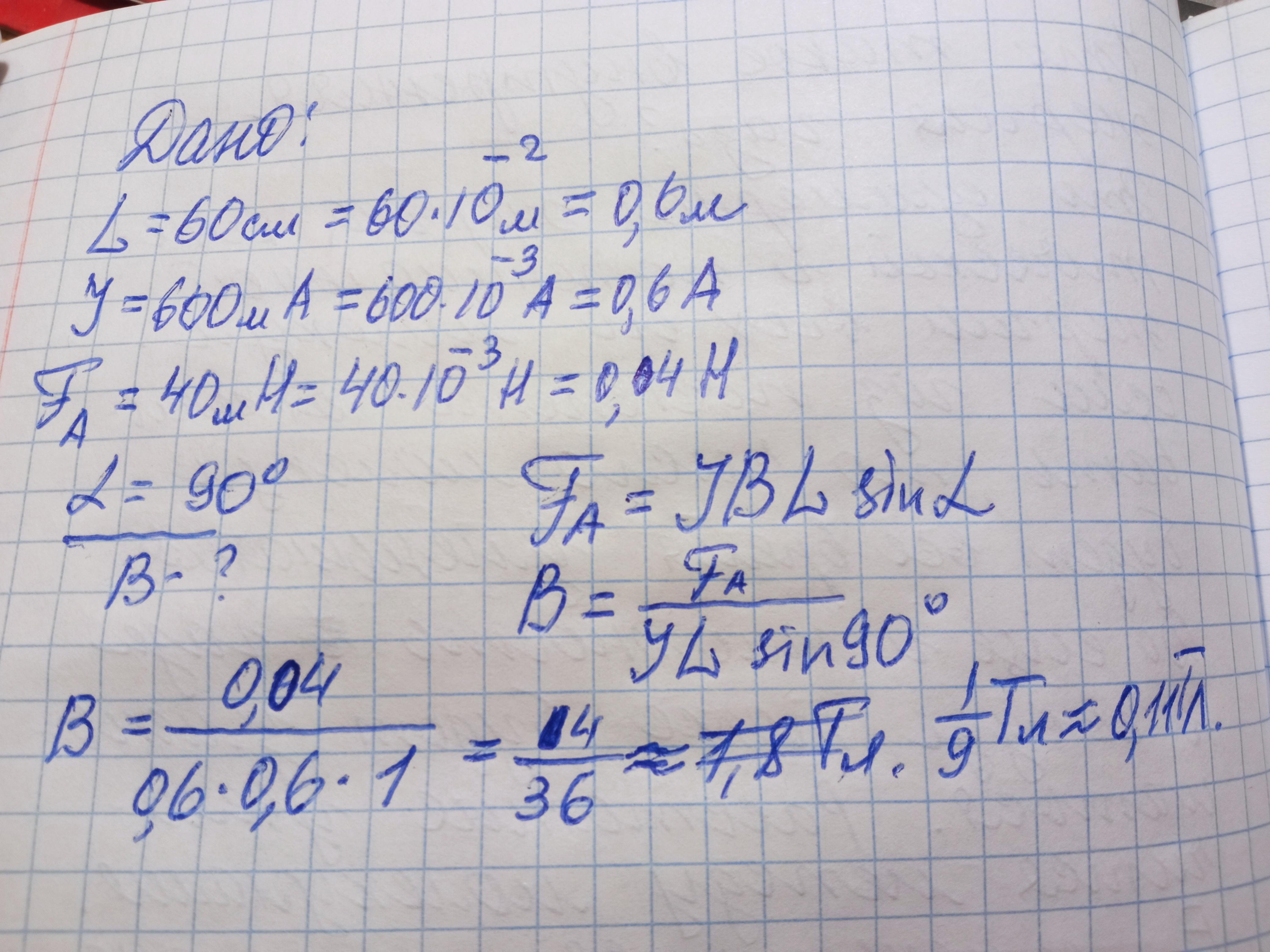 Визначити величину магнітного поля якщо на провідник довжиною 60см при струмі 600мА діє сила 40мH