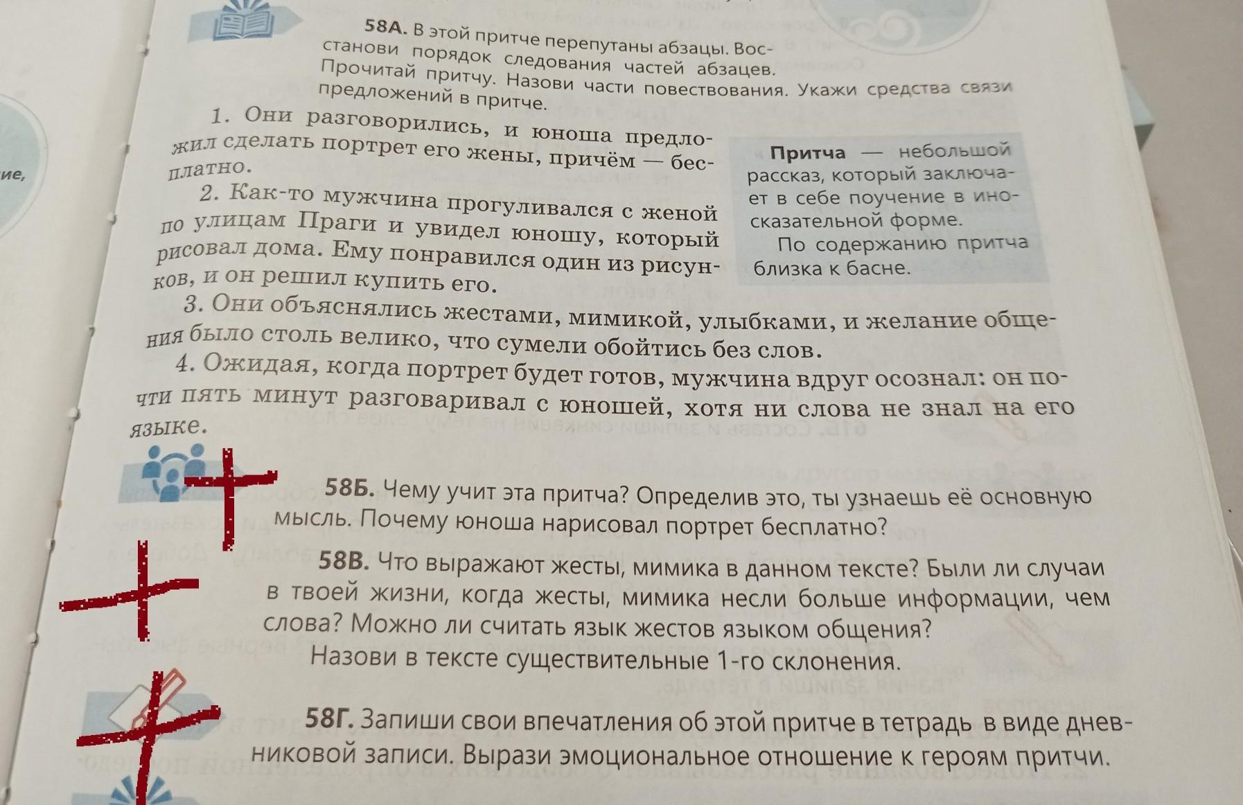 58Б притча учит быть добрее основная мысль рассуждение,юноша нарисовал бесплатно что бы жена этого мужчины была счастлива 58В показывают радость,да когда-то люди не могли сказать что-то, чтобы было бы понятно и они показывали жестами сущ 1 го склон дома 58Г юноша молодец очень хорошо рисует он порадовал мужчину и его жену.
