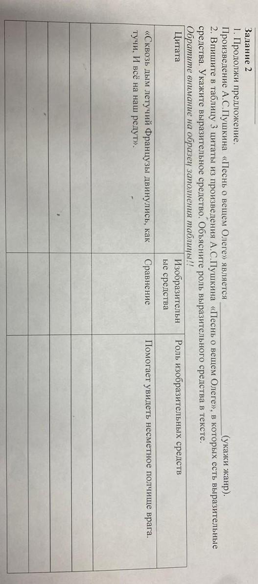 Задание 2 1. Продолжи предложение. Произведение .С.Пушкина «Песнь о вещем Олеге» является (укажи жанр). 2. Впишите в таблицу 3 цитаты из произведения А.С.Пушкина «Песнь о вещем Олеге», в которых есть выразительные средства. Укажите выразительное средство. Объясните роль выразительного средства в тексте. Обратите внимание на образец заполнения таблицы!! Цитата «Сквозь дым летучий Французы двинулись, как тучи, И всё на наш редут». Изобразительн Роль изобразительных средств ые средства Сравнение Помогает увидеть несметное полчище врага.