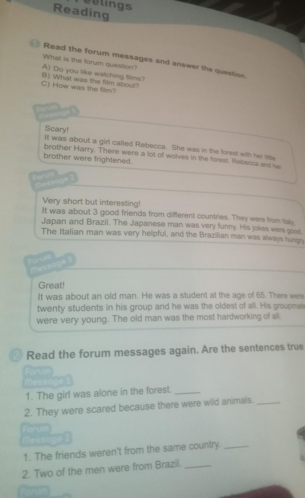 Read the forum messages and answer the question A) Do you like watching f By What was the film abou C) How was the film? It was about a girl called Rebecca. She was in the fore brother Harry. There were a lot of wolves in the forest *********** brother were frightened Very short but interesting It was about 3 good friends from different countries. They were from y Japan and Brazil. The Japanese man was very funny. His pe The Italian man was very helpful, and the Brazilian man 9 Great! It was about an old man. He was a student at the age of 65. There wer twenty students in his group and he was the oldest of all His grou were very young. The old man was the most hardworking of all re the sentences true