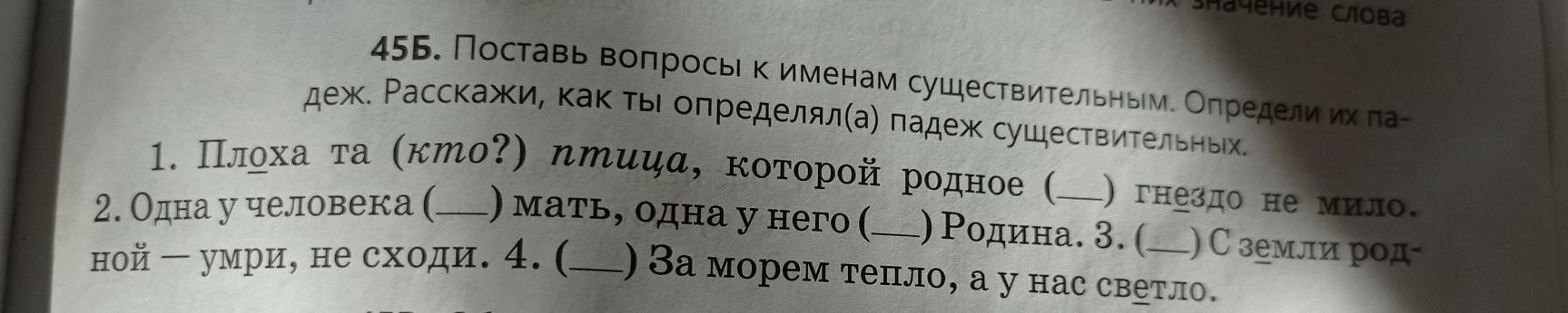 ты понимаешь в них значение слова 45Б. Поставь вопросы к именам существительным. Определи их па- Деж. Расскажи, как ты определял(а) падеж существительных. ной — умри, не сходи. 4. () За морем тепло, а у нас светло. 2. Одна у человека (—) мать, одна у него () Родина. 3. () С земли род- 1. Плоха та (кто?) птица, которой родное (_) гнездо не мило. 45В. Объясни правописание подчеркнутых букв. Подбери прове- рочные слова.
