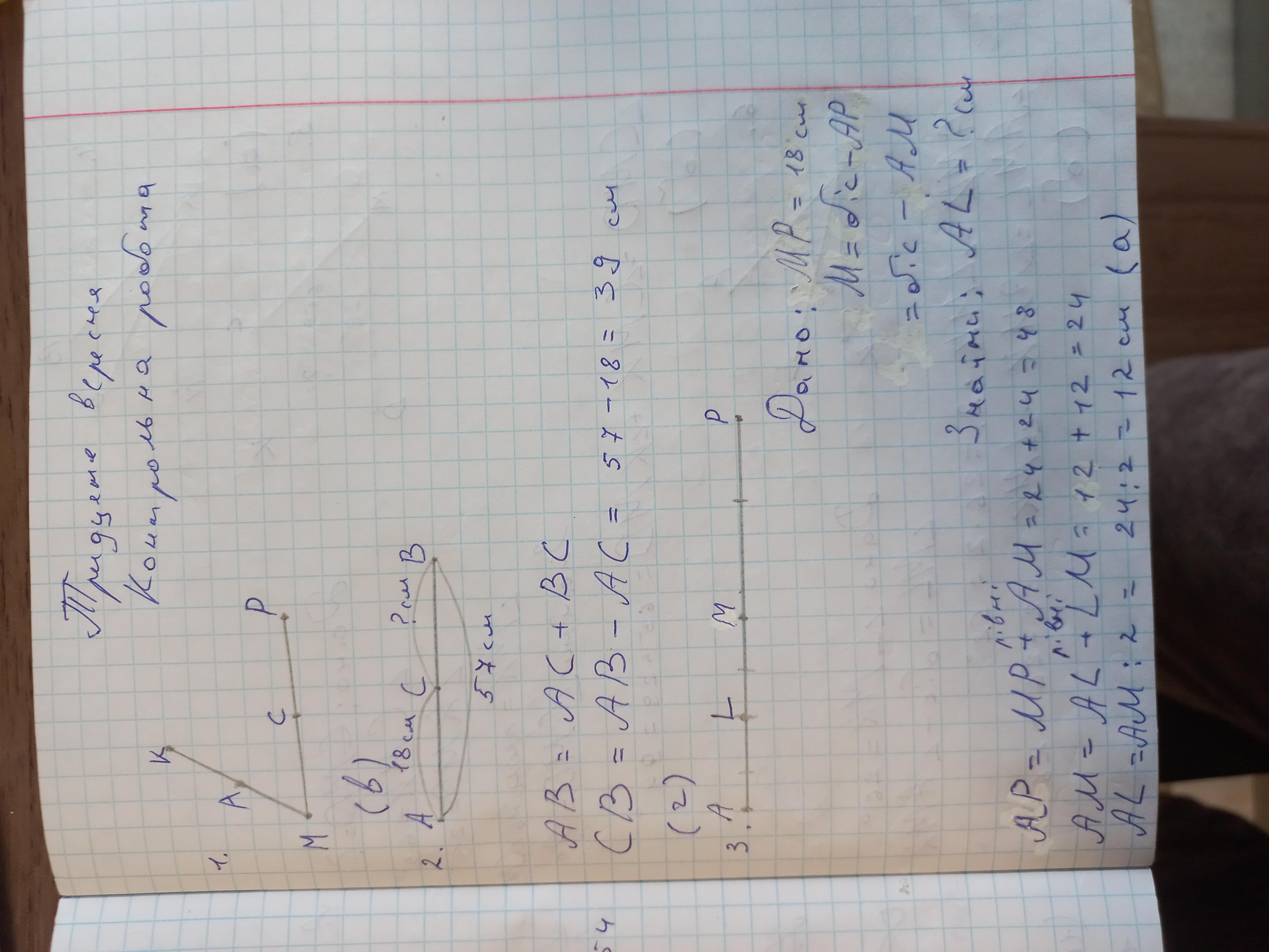 1. Точка К не лежить на прямій МС. Точка А середина вiдрiзка КМ, точка С середина відрізка РМ. Як розміщені прямі АP i KM? Б) визначити неможливо; А) Не перетинаються; В) перетинаються; Г) мають рiвно двi спiльнi точки. 2. Точка С належить вiдрiзку АВ. Чому дорівнює вiдстань ВС, якщо AB=57 см, AC=18 см? А) 39 см; Б) 49 см; в) 65 см; г) 75 см. 3. Точка L середина відрізка АМ, точка М Знайдіть довжину відрізка AL, якщо MP = 24 см. А) 12 см; Б) 24 см; в) 36 см; г) 48 см. 4. Промінь КР проходить між сторонами кута ВКN. Яка з наведених - - рiвностей неправильна, A)