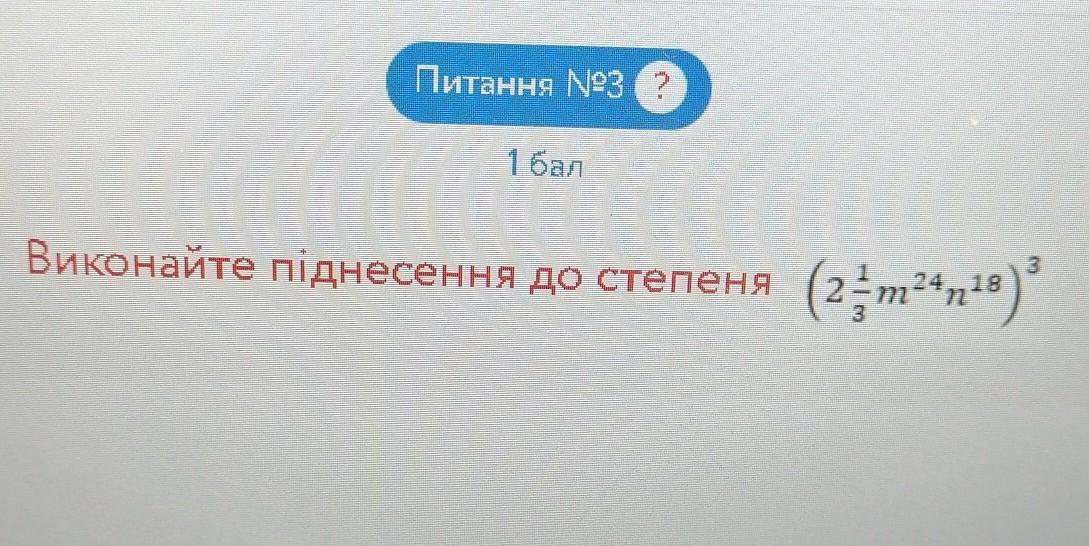 Питання №3 2 I бал Виконайте піднесення до степеня (2;m24n10)* те що на фото ​