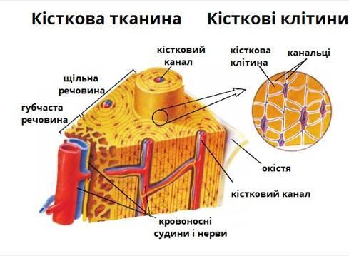 Кістки побудовані з кісткової тканини, яка є різновидом сполучної тканини, складаються із клітин (остеоцити) та міжклітинної речовини, яка містить багато колагену, глікопротеїдів тощо, і мінеральних компонентів (в основному кристали гідрооксиапатиту, Ca10(PO4)6(OH)2). Завдяки цьому кістка має і гнучкість, і міцність.