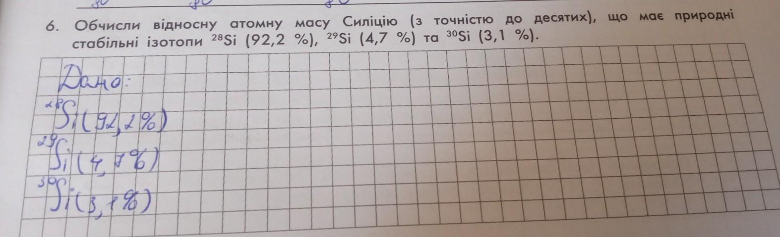 допоможіть будь ласка. 16 о 6. Обчисли відносну атомну масу Силіцію (з точністю до десятих), що має природні стабiльнi iзотопи 28Si (92,2 %), 29Si (4,7 %) та 30i (3,1 %). д Dane: Si(942%) SS (476) Jiu (8) C