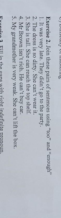 Exercise 2. Join these pairs of sentences using "too" and "enough" 1. It was very late. They didn't go to the party. 2. The dress is so dirty. She can't wear it. 3. She is tall. She can reach the top shelf. 4. Mr Brown isn't rich. He can't buy car. 5. My grandmother is very weak. She can't lift the box.
