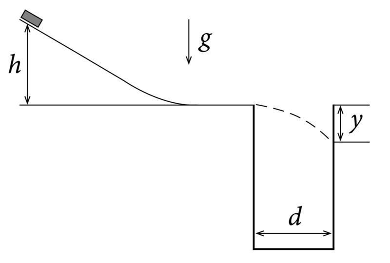Определите значение y для точки удара шайб о противоположную стенку ямы при h=2 м, d=1 м. Ответ выразите в сантиметрах, округлите до сотых.