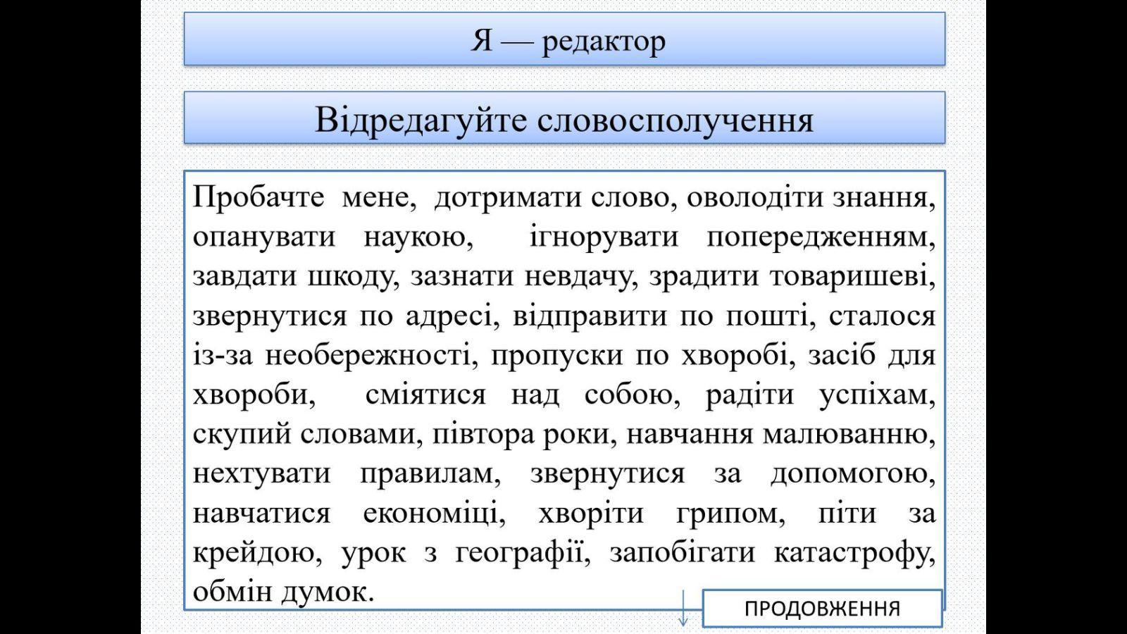 пробачте мені, дотримати слова, оволодіти знаннями, опанувати науку, ігнорувати попередження, завдати шкоди, зазнати невдачі, зрадити товариша, звернутися за адресою, відправити поштою, сталося через необережність, пропуски через хворобу, засіб проти хвороби, сміятися з себе, радіти з успіхів, скупий на слова, півтора року, навчання малювання, нехтувати правилами, звернутися по допомогу, навчатися економіки, хворіти на грип, піти по крейду, урок географії, запобігти катастрофі, обмін думками