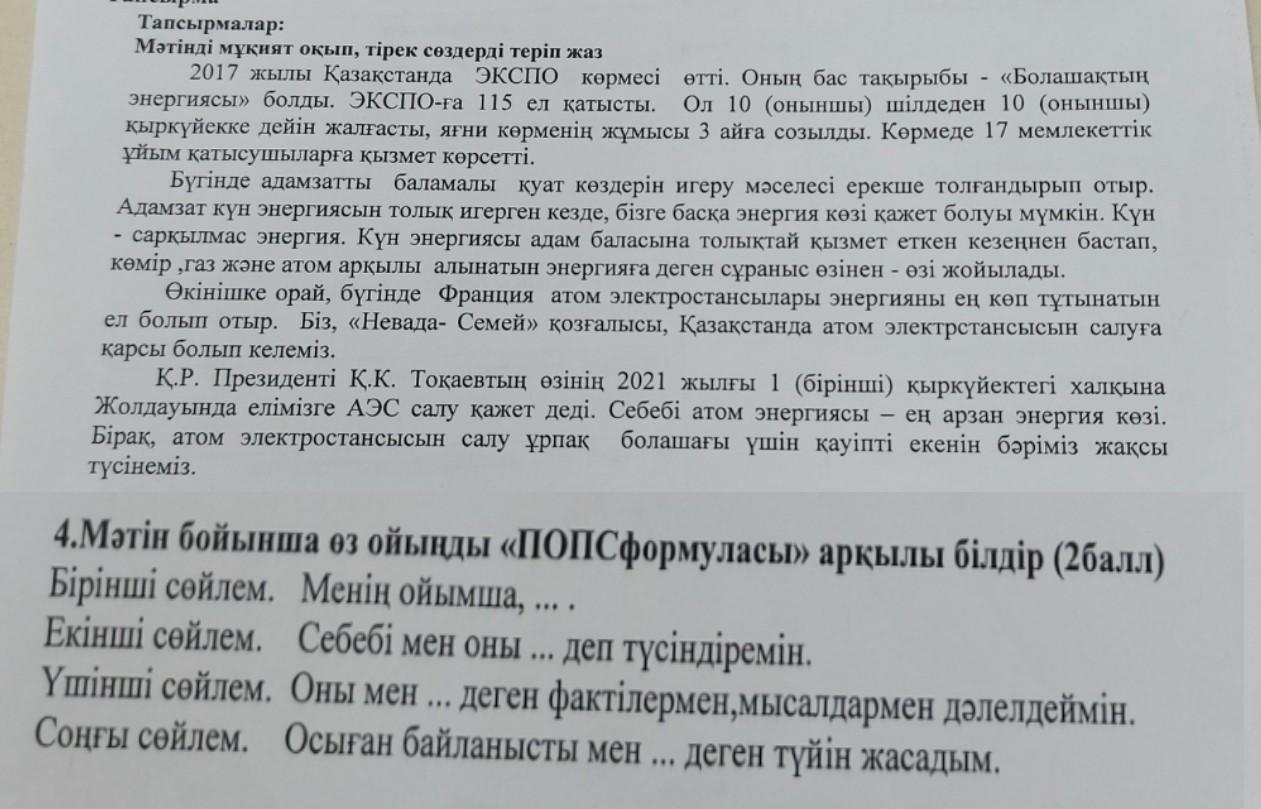 4.Мәтін бойынша өз ойынды «ПОПСформуласы» арқылы білдір (2балл) Бiрiншi сөйлем. Менің ойымша, Екінші сөйлем. Себебі мен оны ... деп түсіндіремін. Үшінші сөйлем. Оны мен ... деген фактілермен,мысалдармен дәлелдеймін. Сонгы сойлем. Осыған байланысты мен деген түйін жасадым. **** ***