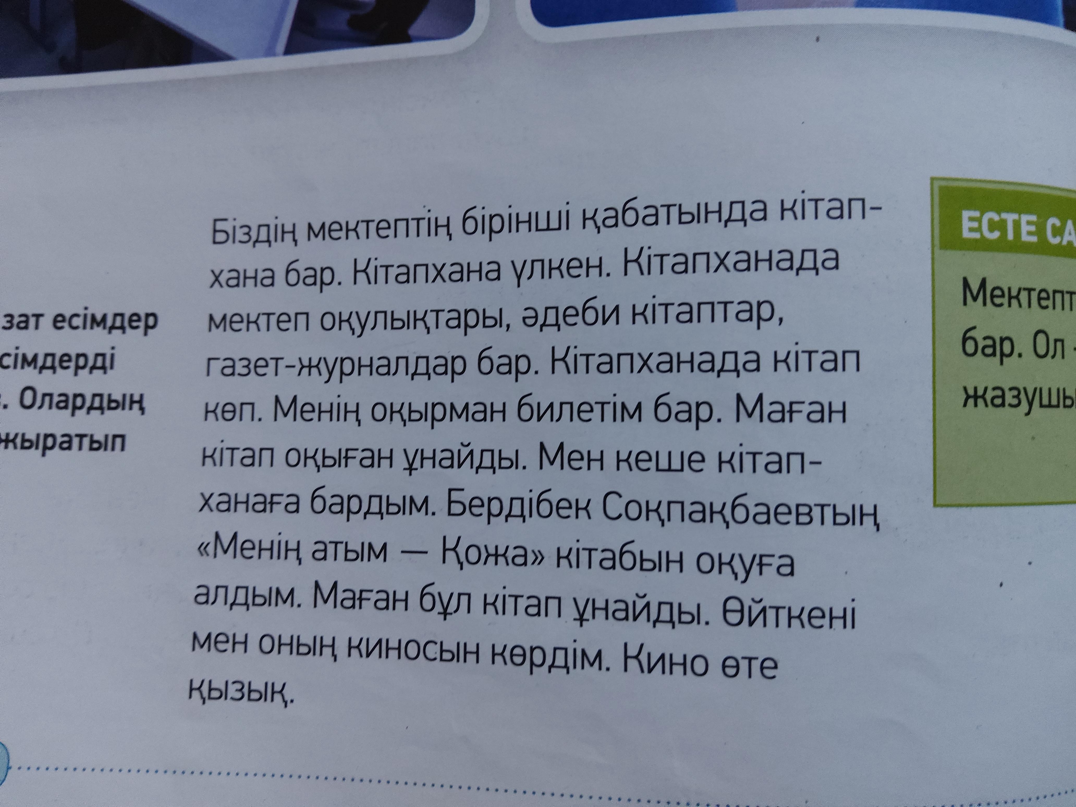имена существительные:кітапхана,мектеп,кітап,Бердібек Соқпақбаев,Қожа,кино