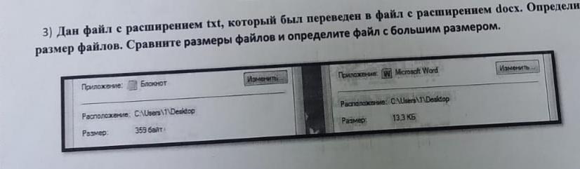 Файл с расширением .docx больше, потому что весит 13619.2 Байта (13.3), а .txt файл 359 байт. .docx больше на 13260.2 байта