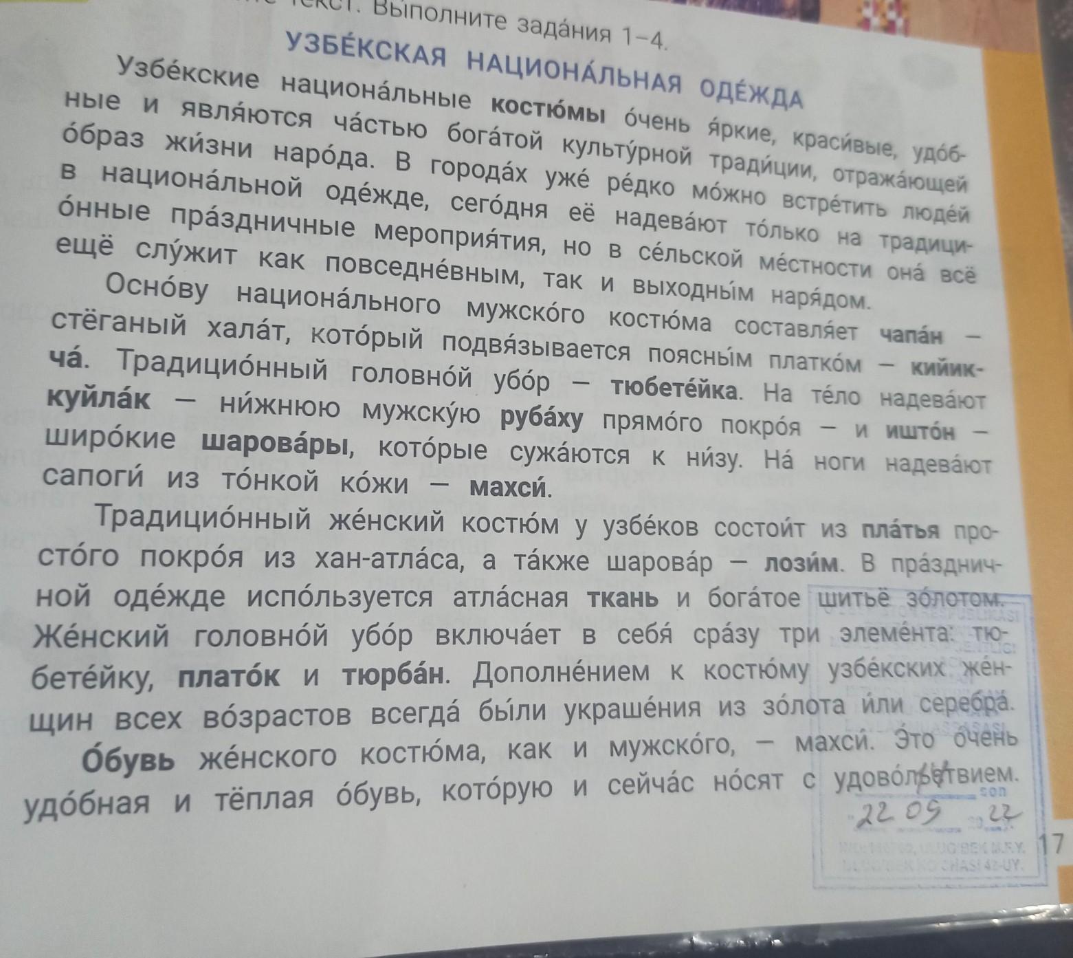 Ответьте на вопросы. 1) Из чего состоит узбекский традиционный мужской костюм? 2) Для чего нужен платок-кийикча? 3) Какая обувь называется махси? 4) Какие головные уборы принято носить в Узбекистане? 5) Сколько школ шитья национальных костюмов есть в Узбекистане