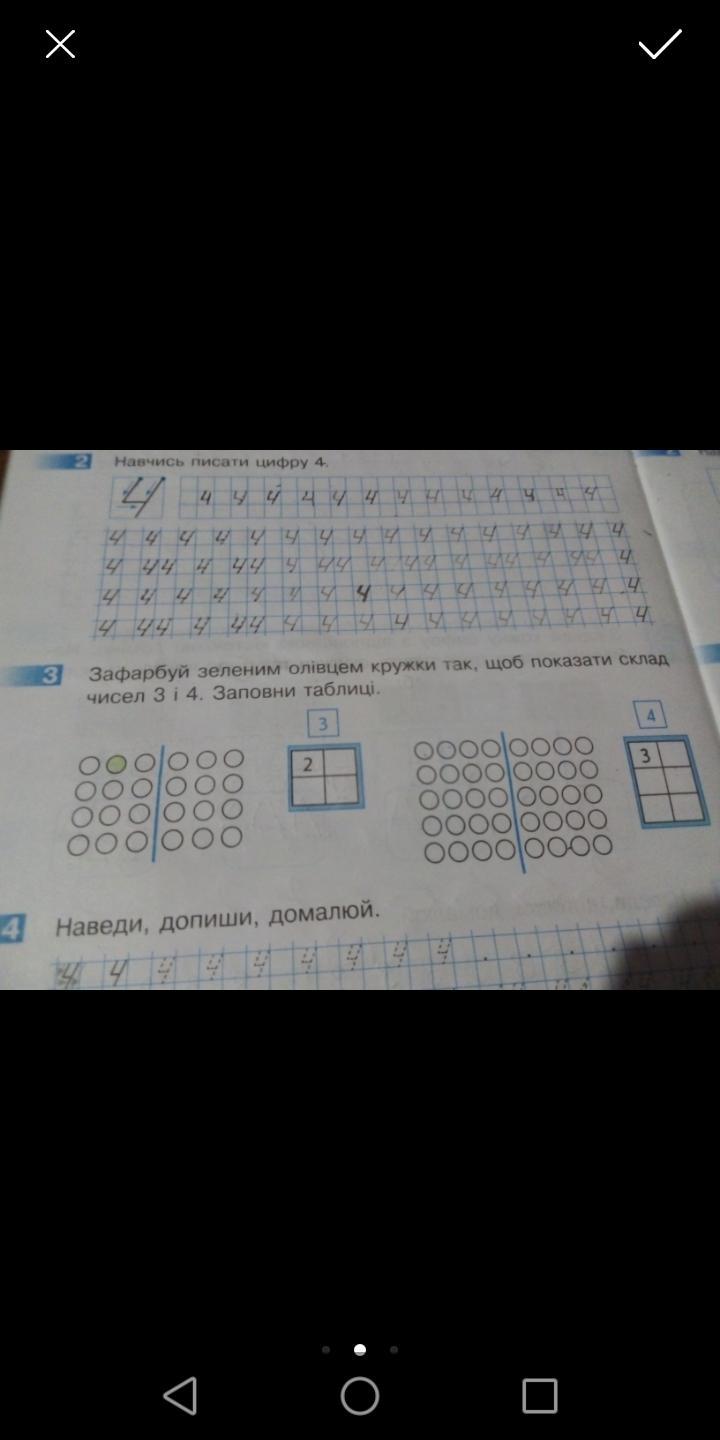 Пошаговое объяснение: зафарбуй зеленим кольором 3 й 4 кружки,а в таблицях допиши до числа 1-цю. Наприклад 2+1.