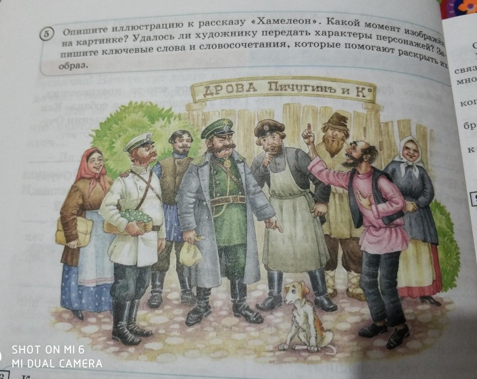 5. Опишите иллюстрацию к рассказу «Хамелеон». Какой момент изображён на картинке? Удалось ли художнику передать характеры персонажей? Запишите ключевые слова и словосочетания, которые помогают раскрыть их образ