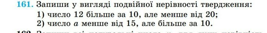 161. Запиши у вигляді подвійної нерівності твердження: 1) число 12 більше за 10, але менше від 20; 2) число а менше від 15, але більше за 10.