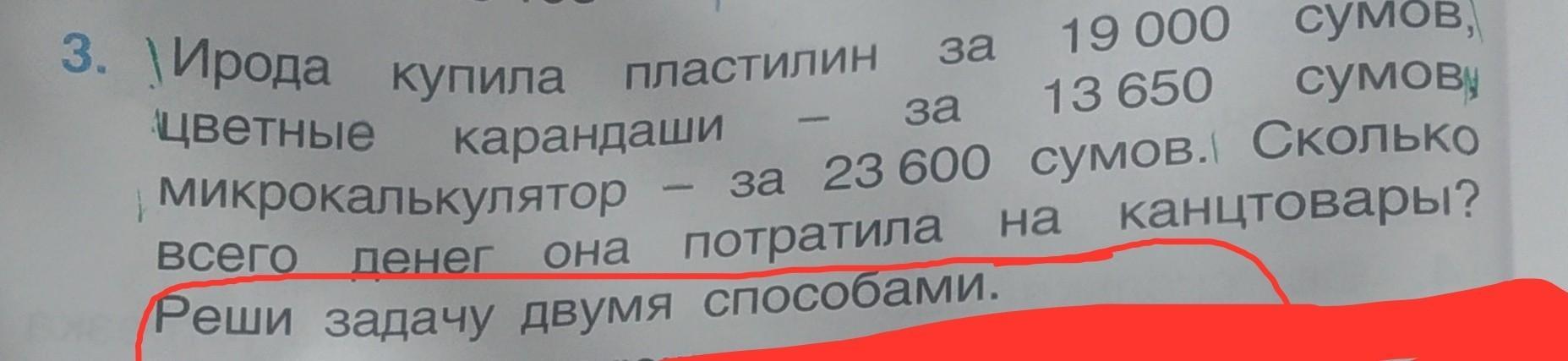 19 000 сумов сумов, за 13 650 за 23 600 сумов. Сколько 3. Ирода купила пластилин за цветные карандаши - микрокалькулятор всего денег она потратила на канцтовары? Реши задачу двумя способами.