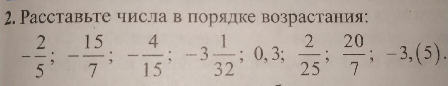 -3,(5); -3 1/32; - 15/7; - 2/5; - 4/15; 2/25; 0,3; 20/7.