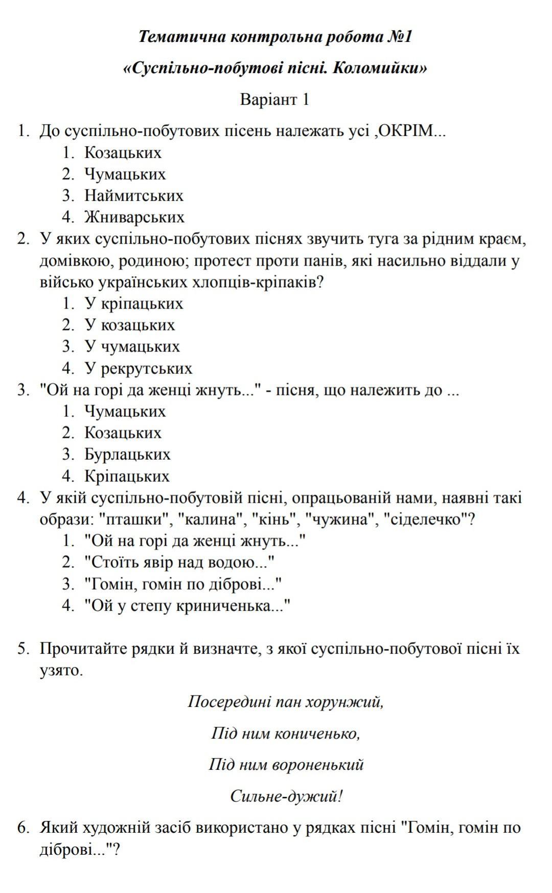 1. 4 2. 4 3. 2 4. 2 5. Ой на горі да женці жнуть 6. Метафори