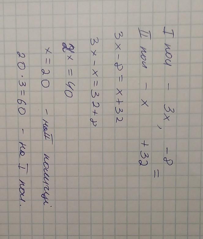 На першій поличці у триі більше книг ніж на другій Коли з першої полиці зняли 8 книг а на другу поклаи 32 книжки то на обоїх полицях їх стало порівноскільки книг булона кожній полиці спочатку