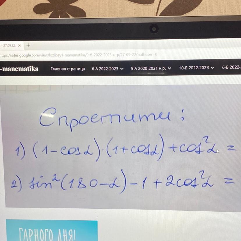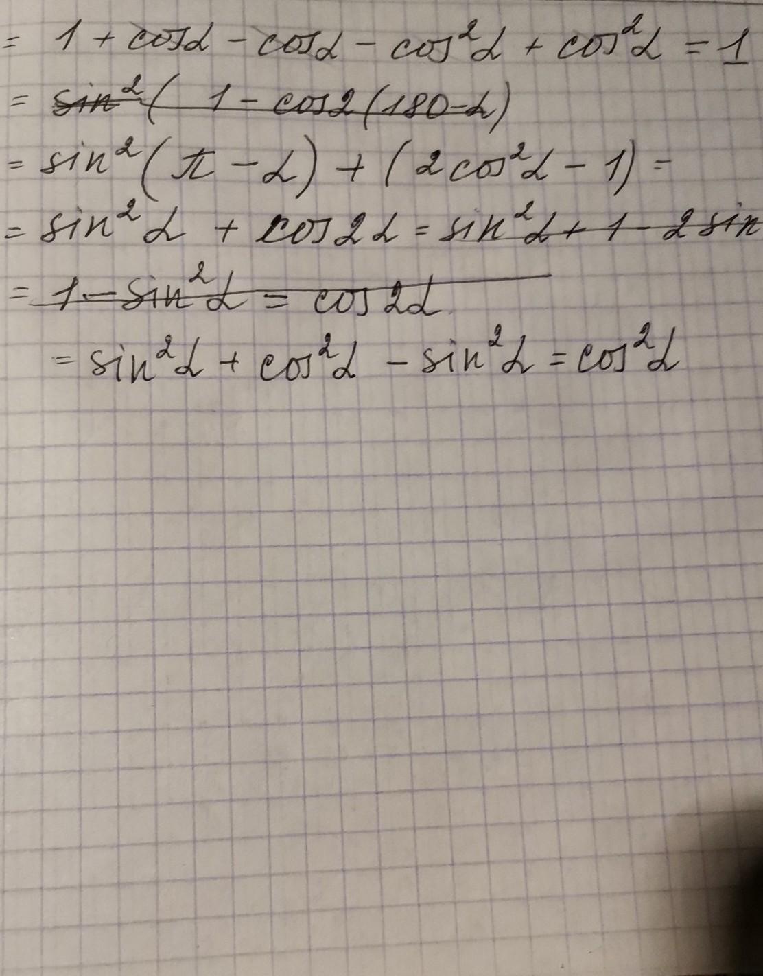 = 1 + \cos \alpha - \cos \alpha - \cos^{2} \alpha + \cos^{2} \alpha = 1 \\ \\ \\ = \sin^{2} (\pi - \alpha) + (2 \ \cos^{2} - 1) = \sin^{2} \alpha + \cos2 \alpha = \sin^{2} \alpha + \cos^{2} \alpha - \sin^{2} \alpha = \cos^{2} \alpha \\