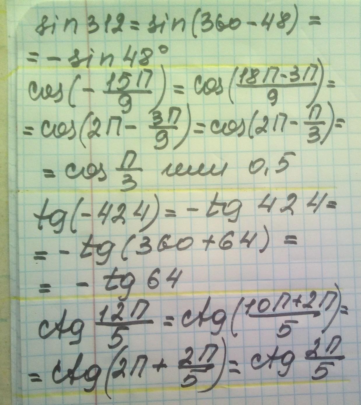 Приведите тригонометрическую функцию произвольного аргумента к тригонометрической функции острого угла