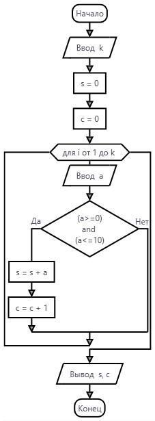 2) С клавиатуры вводиться К чисел . Определить сумму и количество чисел , лежащих в диапазоне от 0 до 10 включительно