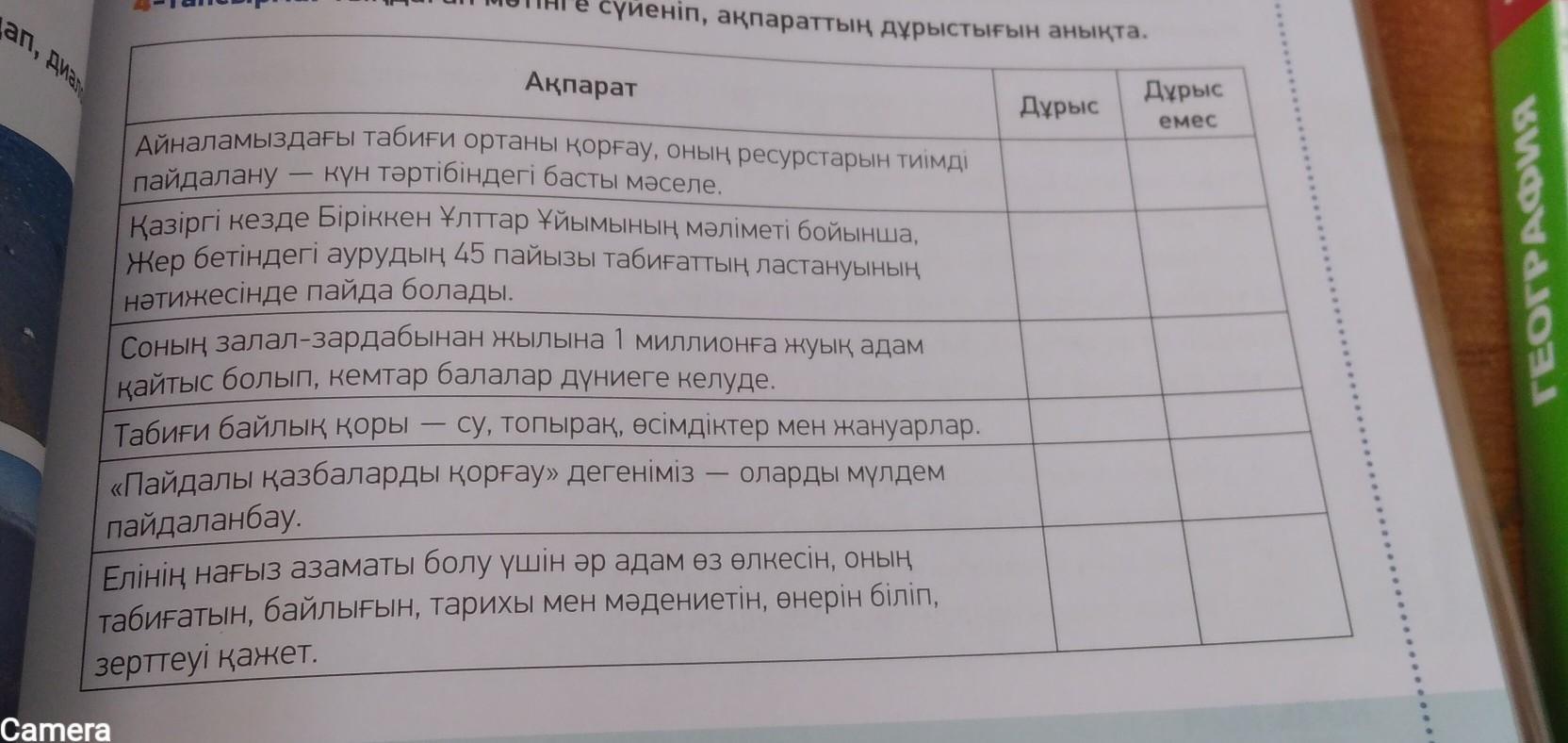 ЖА -тапсырма. Тыңдаған мәтінге сүйеніп, ақпараттың дұрыстығын анықта. Дұрыс Ақпарат Айналамыздағы табиғи ортаны қорғау, оның ресурстарын тиімді күн тәртібіндегі басты мәселе. пайдалану - Қазіргі кезде Біріккен Ұлттар Ұйымының мәліметі бойынша, жер бетіндегі аурудың 45 пайызы табиғаттың ластануының нәтижесінде пайда болады. Соның залал-зардабынан жылына 1 миллионға жуық адам кайтыс болып, кемтар балалар дүниеге келуде. - Табиғи байлық қоры — су, топырақ, өсімдіктер мен жануарлар. «Пайдалы қазбаларды қорғау» дегеніміз - оларды мүлдем пайдаланбау. Елінің нағыз азаматы болу үшін әр адам өз өлкесін, оның табиғатын, байлығын, тарихы мен мәдениетін, өнерін біліп, зерттеуі қажет. Дұрыс емес