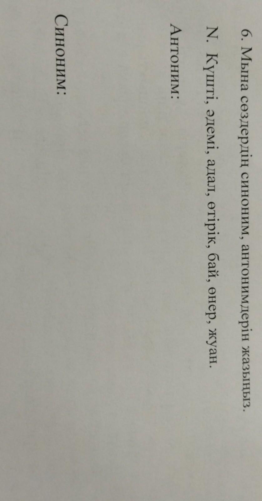 6. Мына сөздердiн синоним, антонимдерiн жазыңыз. N. Күшті, әдемі, адал, өтірік, бай, енер, жуан. Антоним: Синоним:
