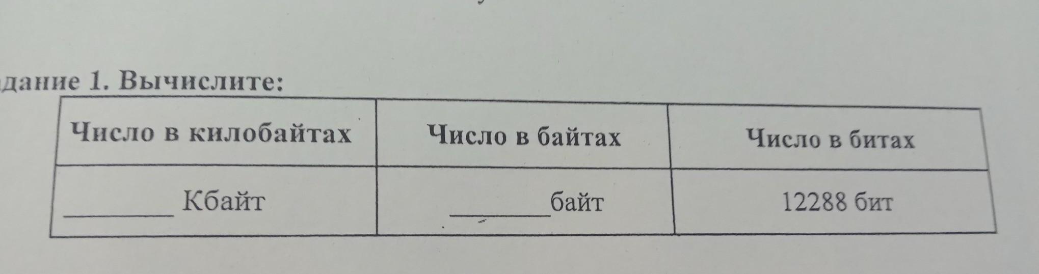 здание 1. Вычислите: Число в килобайтах Кбайт дание 2. Решите задачу; Число в байтах байт Число в битах 12288 бит