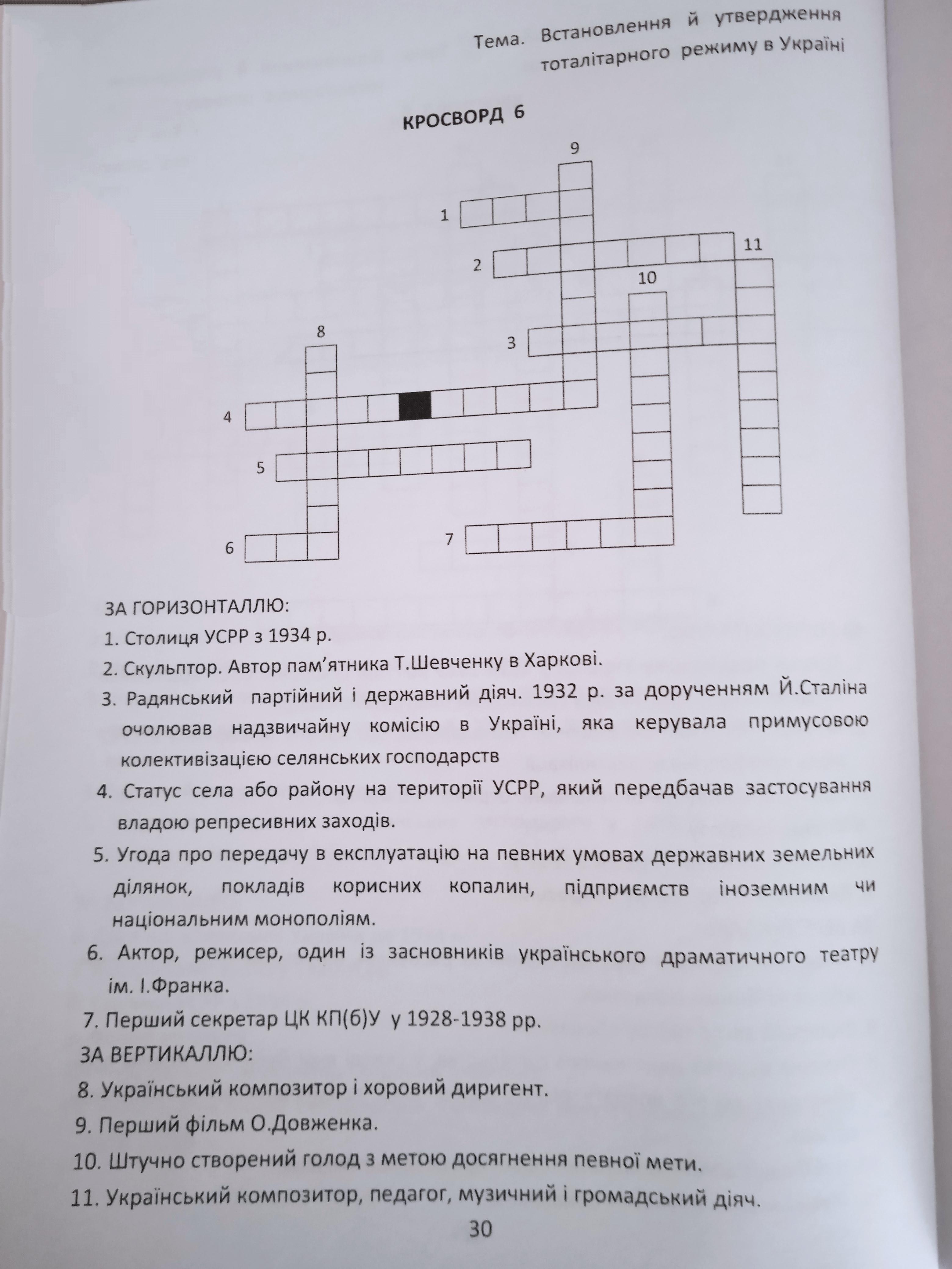 Відповідь: 1.Київ 2.Манізер 3.Молотов 4.Чорна дошка 5.Конседія 6.Юра 7.Косіор 8.Верьовка 9.Звенигора 10.Голодомор 11.Ревуцький