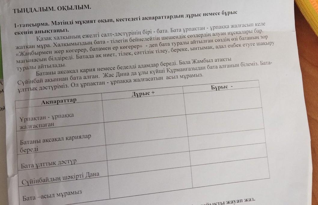 ТЫҢДАЛЫМ. ОҚЫЛЫМ. 1-тапсырма. Мәтінді мұқият окып, кестедегі ақпараттардын дұрыс немесе бұрыс екенін аныктаныз. Казак халкынын ежелгi салт-дәстүрiнiн бiрi - бата. Бата урпактан - ұрпакка жалғасып келе жаткан мұра. Халкымыздын бата-тiлегiн бейнелейтiн шешендік сөздердiн алуан нускалары бар. «Жанбырмен жер көгерер, батамен ер көгерер» - деп бата туралы айтылған сөздің өзi батаның зор мағынасын бiлдiредi. Батада ак ниет, тiлек, сәттілік тілеу, береке, ынтымак, адал енбек етуге шакыру туралы айтылады. Батаны аксакал кария немесе беделді адамдар береді. Бала Жамбыл атакты Суйінбай акыннан бата алған. Жас Дина да улы күйші Құрмангазыдан бата алганын бiлемiз. Бата- ұлттык дәстүріміз. Ол ұрпақтан-ұрпакка жалғасатын асыл мұрамыз. Акпараттар Дұрыс + Ұрпактан - ұрпакка жалгаспаган Батаны аксакал кариялар береді Бата улттык дәстүр Суйінбайдың шәкірті Дана Бата -асыл мұрамыз Бұрыс кты жауап жаз.