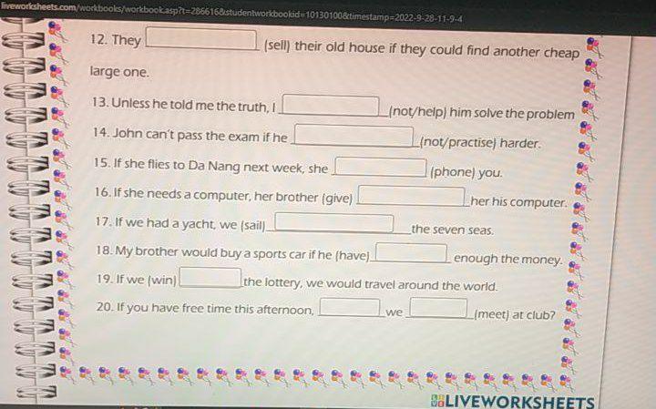 1) come 2) learned 3) will go 4) was/were 5) has 6) would buy 7) has 8)will be 9) will prepare 10) won't pass 11) gets 12) would sell 13) would not help 14) doesn't practise 15) will phone 16) will give 17) would sail 18) had 19) won 20) can/will/may we meet