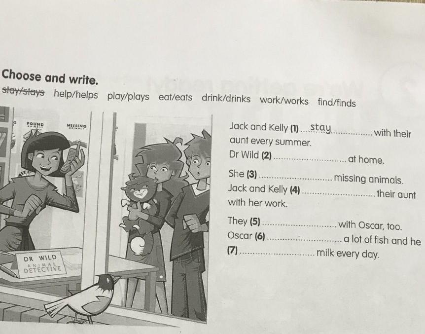 Відповідь: 2 works. 3 finds. 4 help. 5 play. 6 eats. 7 drinks