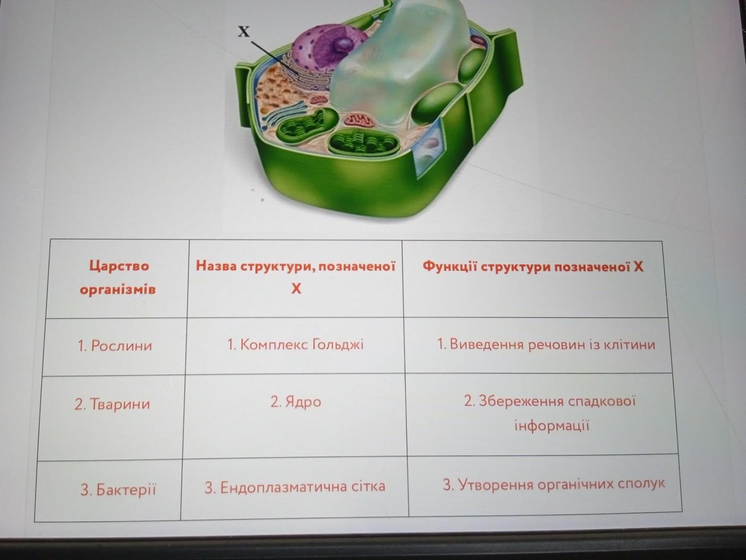 Царство організмів 1. Рослини 2. Тварини 3. Бактерії Назва структури, позначеноï X 1. Комплекс Гольджі 2. Ядро 3. Ендоплазматична сітка Функції структури позначеної х Відповідь 1. Виведення речовин із клітини 2. Збереження спадкової інформації 3. Утворення органічних сполук
