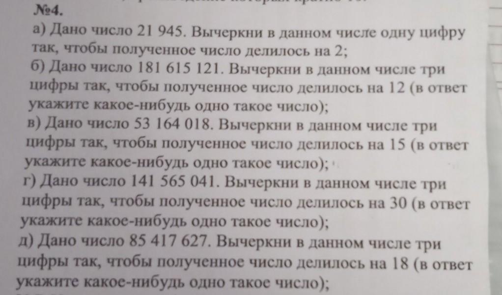 №4. а) Дано число 21 945. Вычеркни в данном числе одну цифру так, чтобы полученное число делилось на 2; б) Дано число 181 615 121. Вычеркни в данном числе три цифры так, чтобы полученное число делилось на 12 (в ответ укажите какое-нибудь одно такое число); в) Дано число 53 164 018. Вычеркни в данном числе три цифры так, чтобы полученное число делилось на 15 (в ответ укажите какое-нибудь одно такое число);' г) Дано число 141 565 041. Вычеркни в данном числе три цифры так, чтобы полученное число делилось на 30 (в ответ укажите какое-нибудь одно такое число); д) Дано число 85 417 627. Вычеркни в данном числе три цифры так, чтобы полученное число делилось на 18 (в ответ укажите какое-нибудь одно такое число); помогите пожалуйста:( все а,б,в,г,д