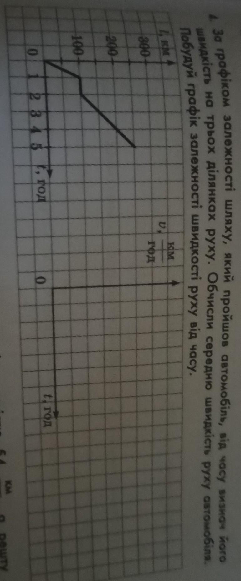 4. За графіком залежності шляху, який пройшов автомобіль, від часу визноч його швидкість на трьох ділянках руху. Обчисли середню швидкість руху автомобіля. Побудуй графік залежностi швидкості руху від часу.