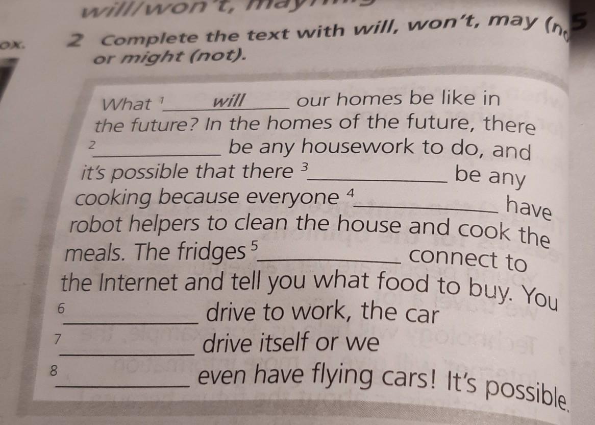 6 robot helpers to clean the house and cook the meals. The fridges 5 connect to the Internet and tell you what food to buy. You drive to work, the car drive itself or we even have flying cars! It's possible 7 8 What 1 will our homes be like in the future? In the homes of the future, there be any housework to do, and be any have 2 it's possible that there 3 cooking because everyone 4 помогите дам 75 баллов