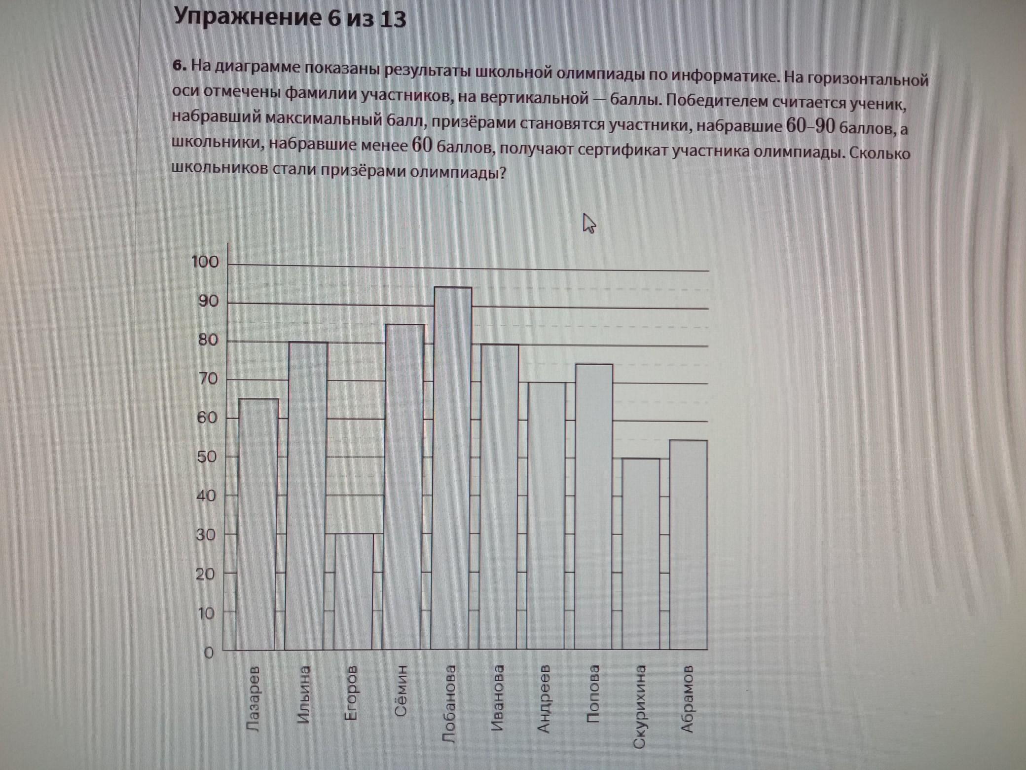 6 учеников так как только 6 столбиков высотой от отметки 60 до отметки 90