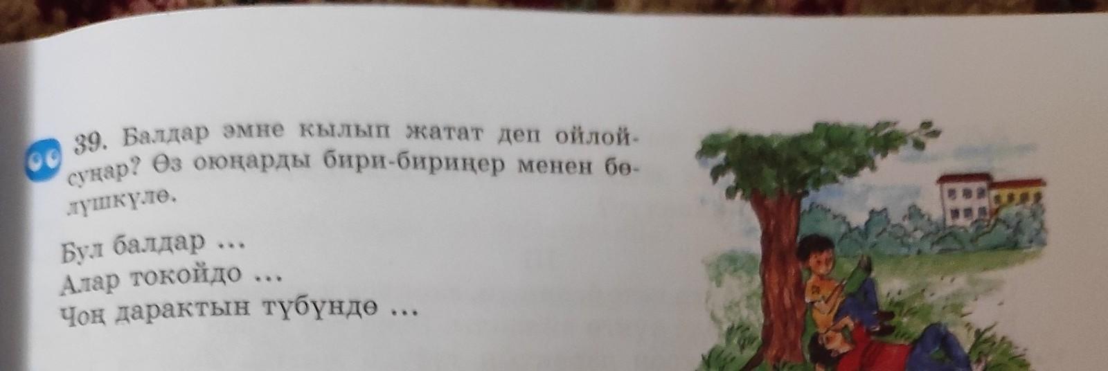 39. Балдар эмне кылып жатат деп ойлой- суңар? Өз оюңарды бири-бириңер менен бө- лүшкүлө. Бул балдар ... Алар токойдо .. ... Чоң дарактын түбүндө ...