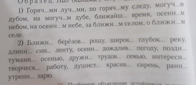 1) Горячими лучами [Т.п]; по горячему следу [Д.п]; Могучим дубом [Т.п]; На могучем дубе [П.п]; Ближайшее время [И.п]; Осенним небом [Т.п]; На осеннем небе [П.п]; За ближним селом [В.п]; О ближним селе [П.п]