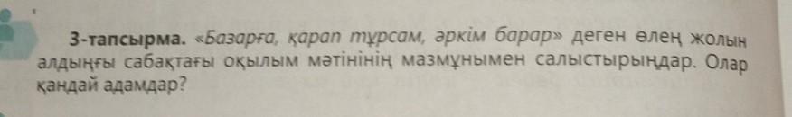 3-тапсырма. «Базарға, қарап тұрсам, әркiм барар» деген өлең жолын алдынғы сабақтағы оқылым мәтінінің мазмұнымен салыстырындар. Олар кандай адамдар?