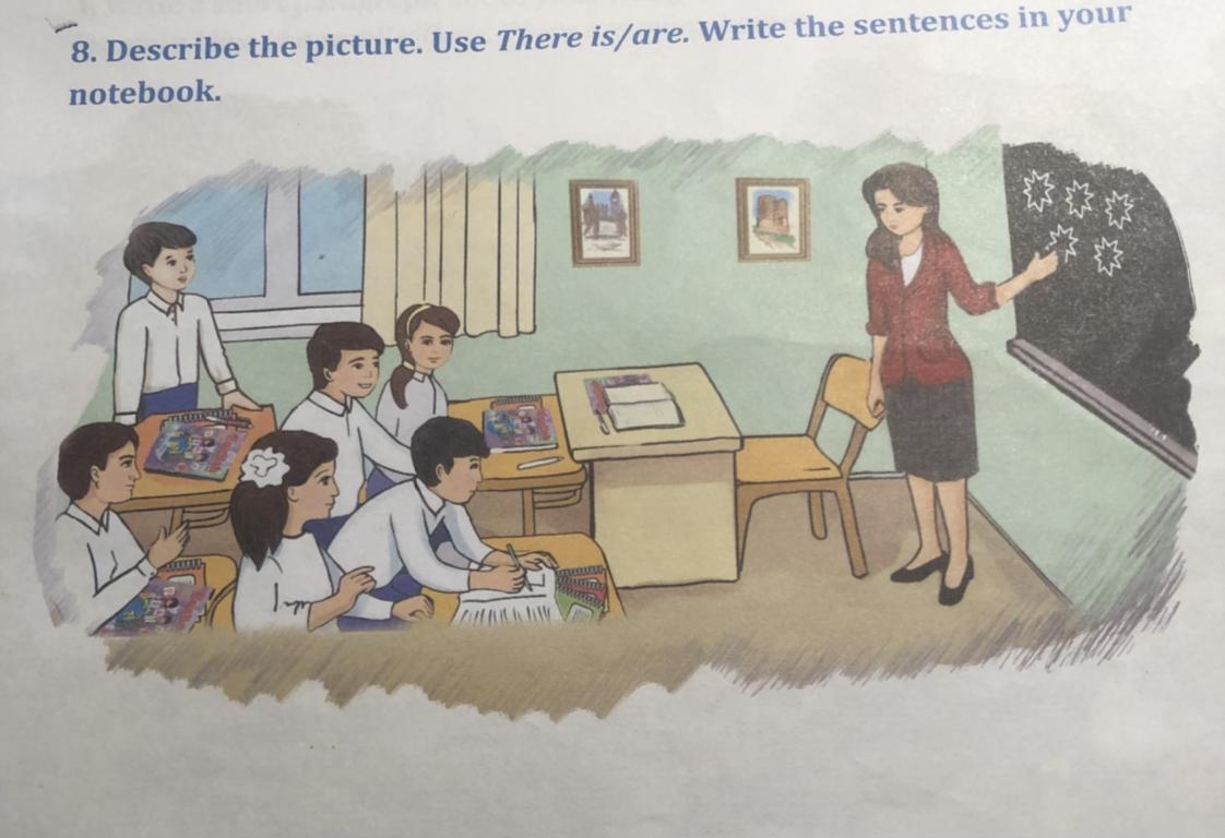 There is a classroom in the picture. There are six students and one teacher. There are also two pictures on the wall. There are four desks and one table. There is one window in the classroom.