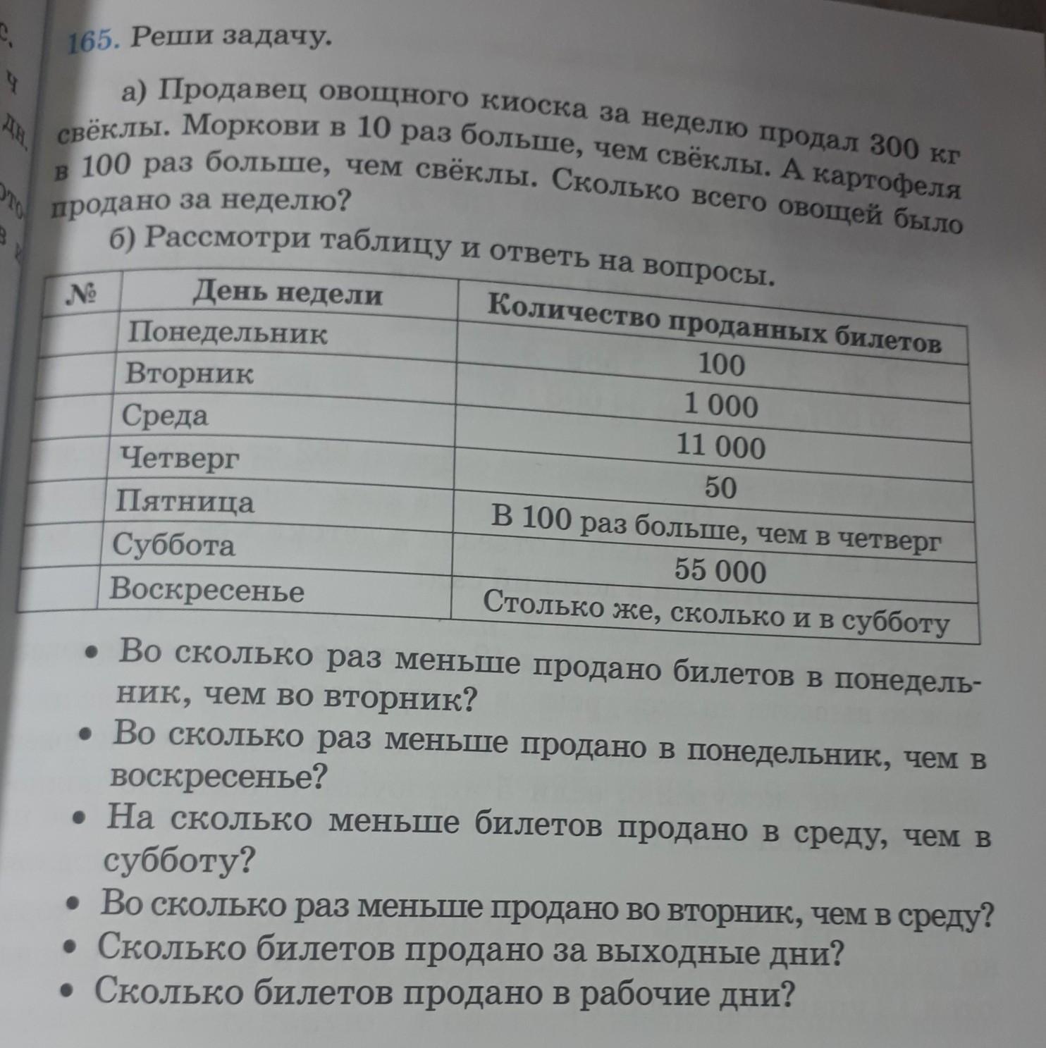 165. Реши задачу. a) Продавец овощного киоска за неделю продал 300 кг свёклы. Моркови в 10 раз больше, чем свёклы. А картофеля B в 100 раз больше, чем свёклы. Сколько всего овощей было продано за неделю? б) Рассмотри таблицу и ответь на вопросы. №o День недели Понедельник Вторник Среда Четверг Пятница Суббота Воскресенье Количество проданных билетов 100 1 000 11 000 50 В 100 раз больше, чем в четверг 55 000 Столько же, сколько и в субботу • Во сколько раз меньше продано билетов в понедель- ник, чем во вторник, • Во сколько раз меньше продано в понедельник, чем в воскресенье, • На сколько меньше билетов продано в среду, чем в субботу? • Во сколько раз меньше продано во вторник, чем в среду? • Сколько билетов продано за выходные дни? • Сколько билетов продано в рабочие дни?